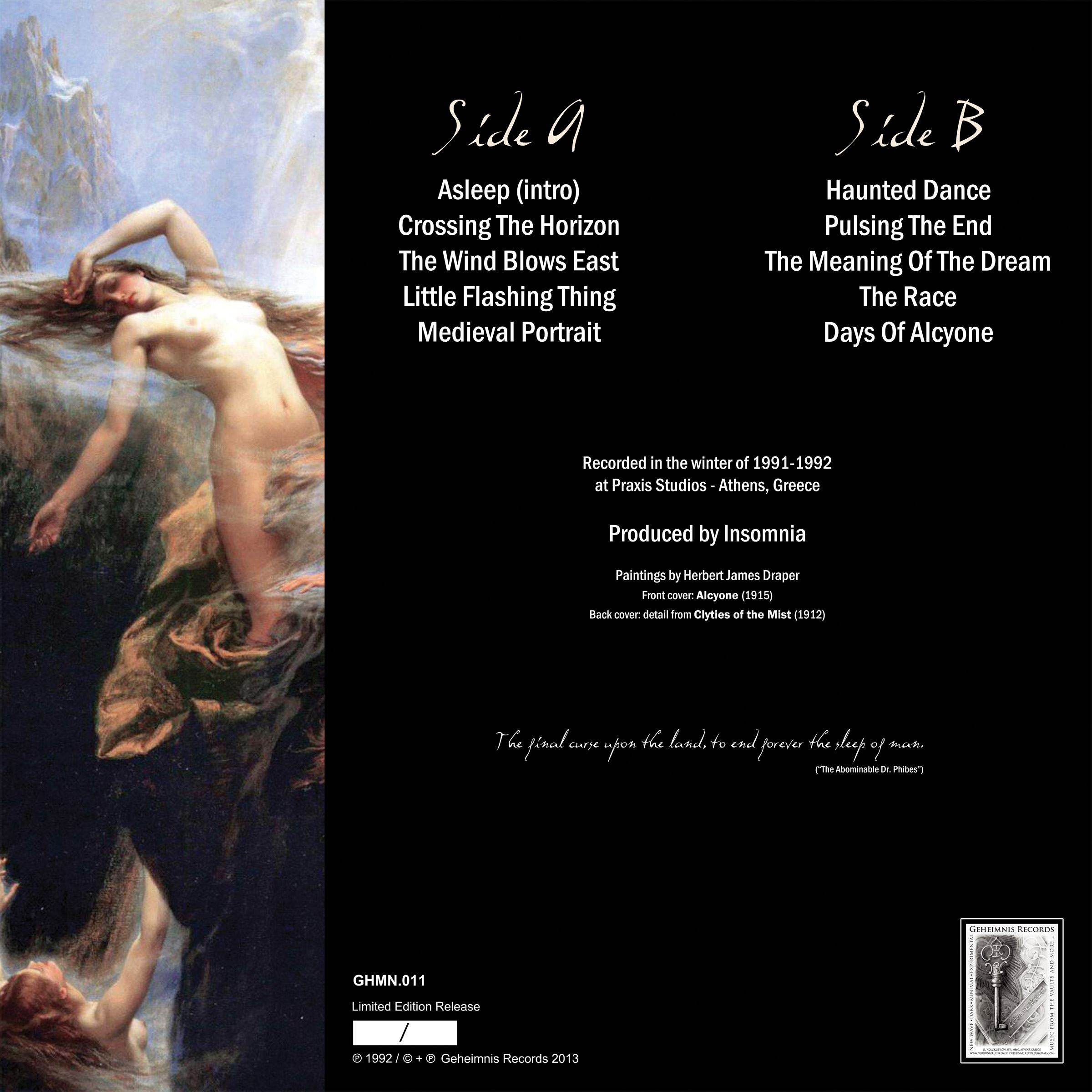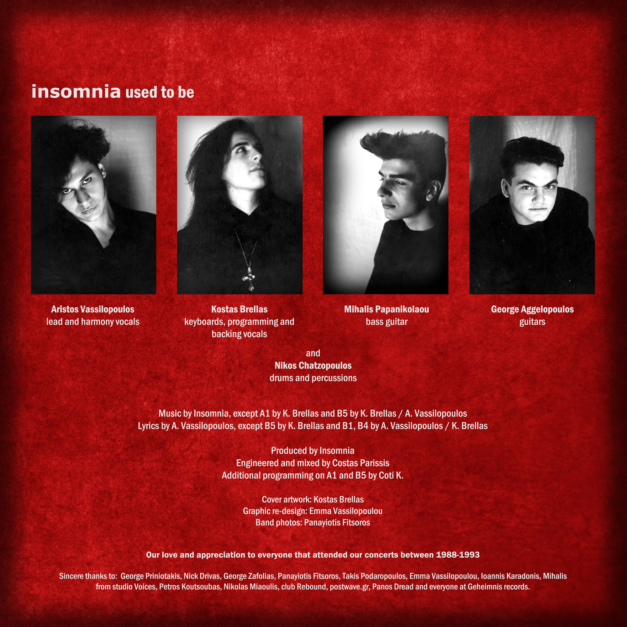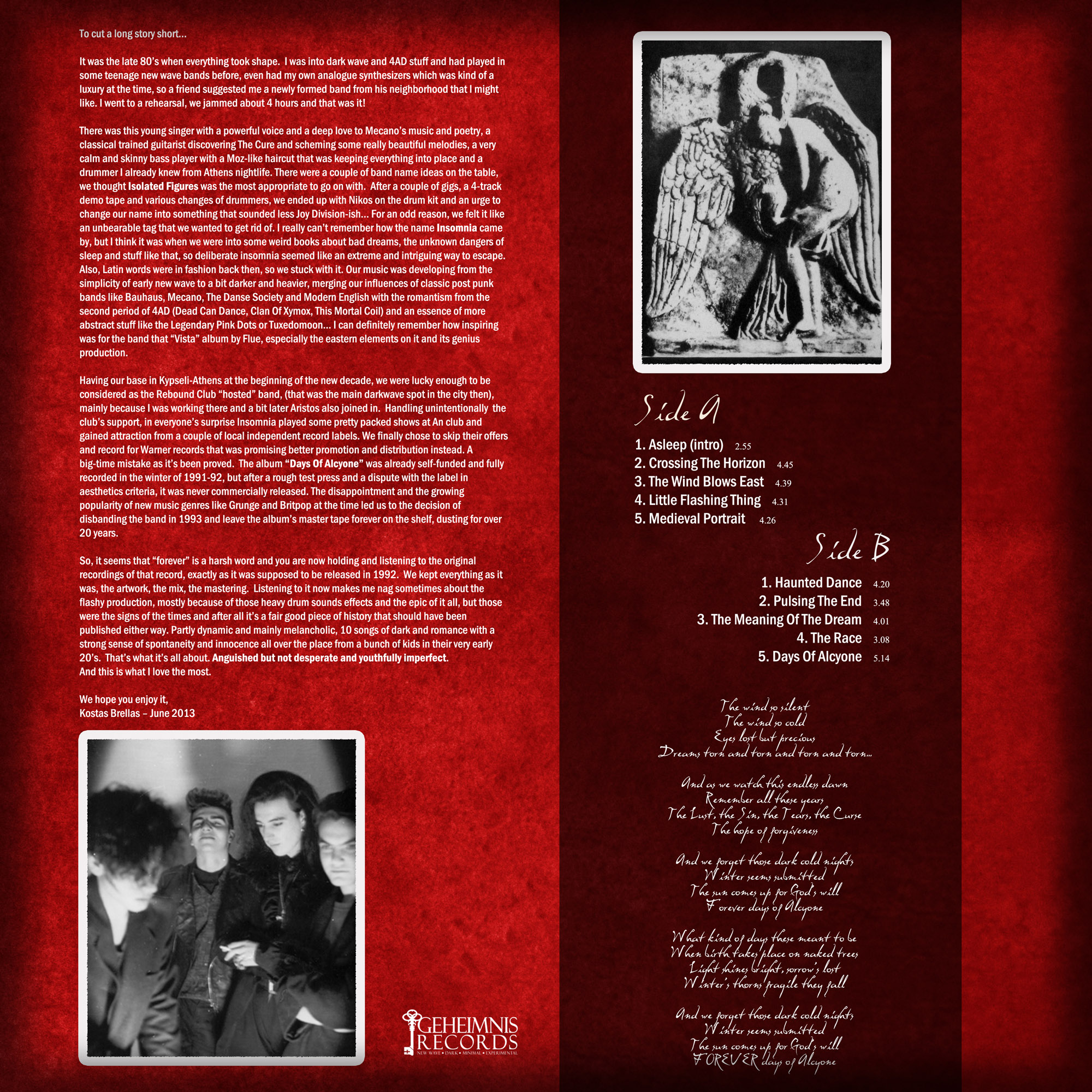 | One of the most well-hidden secrets of the Greek new wave/dark wave society is about to be revealed 21 years after its first recording. Geheimnis Record’s 11th release is the long awaited unreleased album of “Insomnia” from 1992 and we feel very happy and content to have a true lost darkwave gem released from our label for the very first time! Insomnia were formed in 1988 in Athens, Greece. Their first name was “Isolated Figures” but dropped out very soon, because of its very Joy Divisionish reminiscence sound. The band was consisted of : Aristos Vassilopoulos on vocals, Kostas Brellas on synths, George Aggelopoulos – guitars, Mihalis Papanikolaou – bass and John Kaoudis – drums. After rehearsing with lots of different drum players, they ended up to collaborate with Nikos Hantzopoulos (later drum player at the 90’s band “Closer”). Their sound is fully influenced by the early 80’s new wave and post punk bands of that era (Mecano, The Danse Society, Bauhaus e.t.c.) and of course from the atmospheric 4AD sound that dominated around the years 1983 – 1986. They gave some unexpectedly successful live concerts during the years 1989 to 1992 and they managed to fill several times the then newly founded “AN” club at Exarchia square, in downtown Athens. During the fall of 1991 they reached an agreement with Warner Music and entered the studio to start recording a full LP album. The result of these recording sessions is the album “Days of Alcyone” that you’re holding in your hands, back then scheduled to be released, according the record company’s plans, during the winter of 1992. A test-pressing record was cut and everybody in the band waited for the date of release, but it turned out to be a postponement race because of the arguments raised upon the music orientation of the band and the record company’s obsession to re-record the vocals in the native (Greek) language. The band was unwilling to succumb to Warner Music’s pressures and as it’s been proved this album was not meant to be released at all. Under these circumstances, Insomnia got tired of waiting 2 long years while they were playing the same songs over and over again to promote the record and having a load of new material that they could not record and move forward. Finally, disappointed because of the record company’s inconsistence to release their album, they split up in 1993. Geheimnis Records, after 21 years of waiting, brings to you this lost LP album in 324 hand-numbered copies, 162 of them in black colour and 162 in deep transparent red. The album was pressed using the original master tapes, slightly and respectfully re-mastered. Contains a full colour insert with bio, photos and other details of the band. Out in June 27th, 2013 !! You can purchase it now from Bandcamp.com