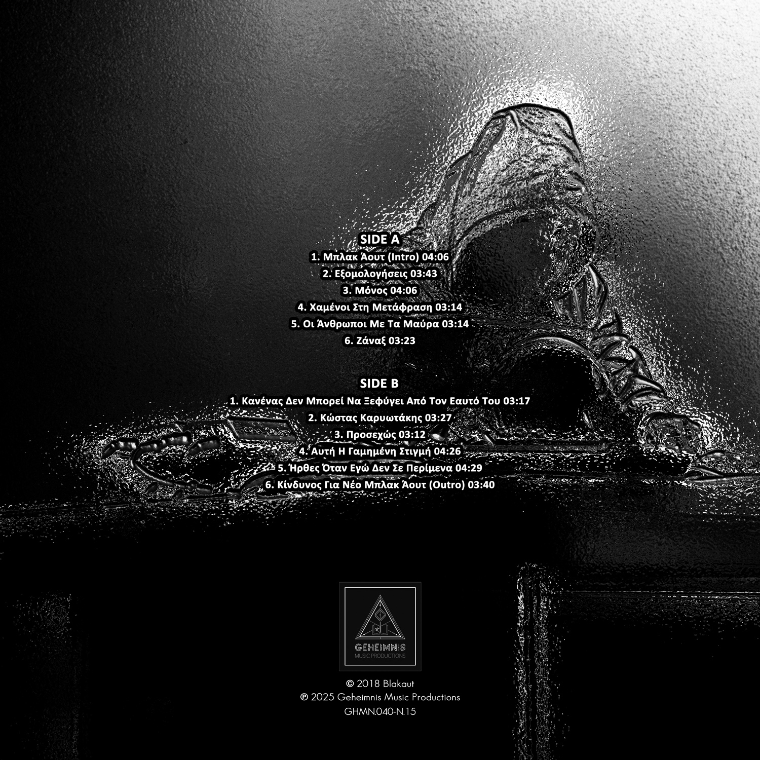 | Blakaut is the brainchild of Alkis Chatzoglou, started back in 2017. His sound moves along cold electronic paths and is inspired by life in Athens. Up to this date, he has released 8 full albums and performed live in many cities in Greece. "ΣΥΣΚΟΤΙΣΗ" (BLACK-OUT) is his second full-length album released back in 2018 on cassette-tape and digital format and now for the first time on vinyl, starting a collaboration with Geheimnis Music Productions. The album will come out on June 26th, 2025, in 318 hand-numbered copies, 164 on black and 154 on green transparent. The edition includes an insert with infos and credits. Last coloured copy and last 3 black copies from stock clearance. | ||