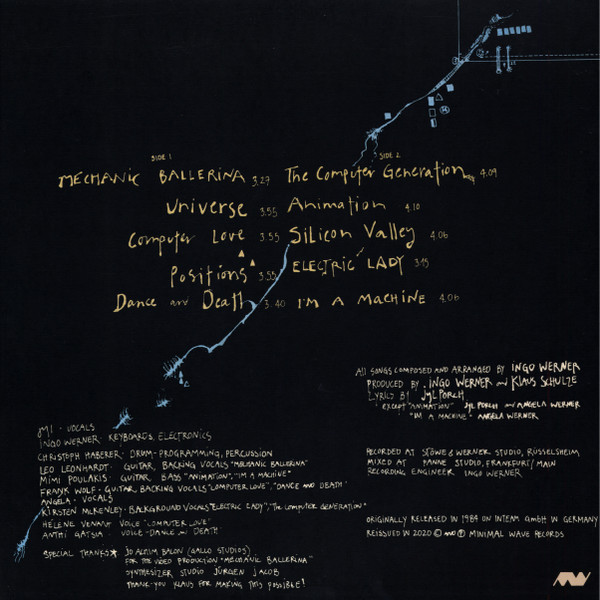 | Minimal Wave is honoured to present a reissue of Jyl‘s self-titled full-length album from 1984, originally released on Klaus Schulze’s Inteam label. Born and raised in California, Jyl travelled to Europe in her twenties to dance and met several talented and like-minded collaborators along the way. She ended up in Germany, and worked with Ingo Werner, Angela Werner, and Klaus Schulze, on what would become one of the most important and forward thinking electronic albums of the time. Shortly after its release, the song “Computer Love” became a mini-hit along with the album’s opening track “Mechanic Ballerina”. The lyrics of “Silicon Valley” and “Computer Generation” are reflective of the times and have become even more relevant now, 36 years later. The production and song arrangement on the album is immaculate. The synthesizers, drum programming and vocal contributions complement Jyl’s voice perfectly. The album contains an incredible depth beyond a regular dance album likely due to the spirit of the people behind it – the list of contributors add to its significance and near-mythological mystery. After years of searching to no avail, the master tapes were finally located and we were able to remaster them for the best possible audio result. The record is pressed on black 180 gram vinyl and comes housed in a glossy heavyweight sleeve. The sleeve features an updated version of the original artwork, and is accompanied by a 12 page LP sized booklet, featuring large scale portraits of Jyl from the time, an interview and all of Jyl’s previously unpublished lyrics. In Mint condition. | ||