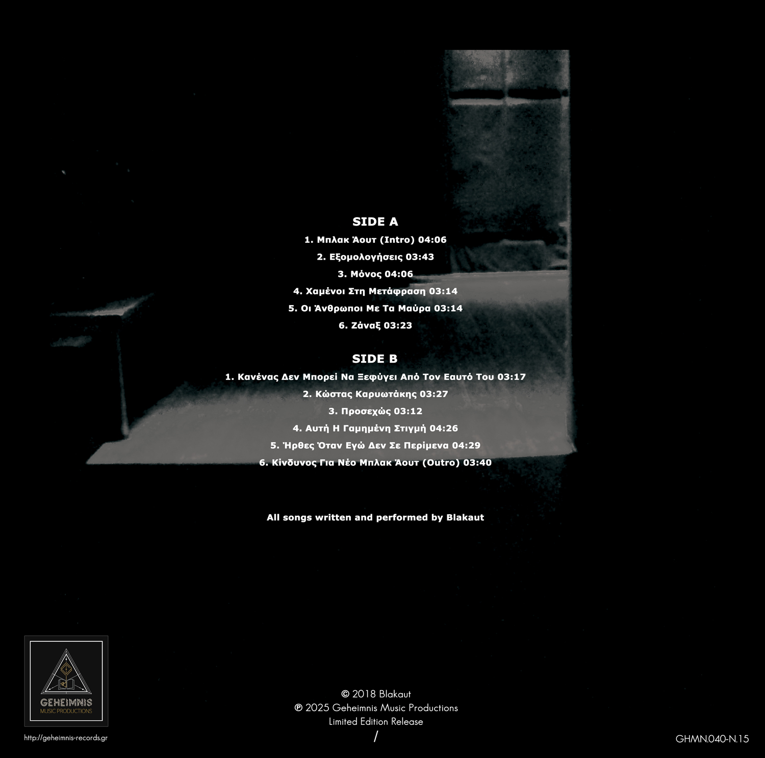 Blakaut is the brainchild of Alkis Chatzoglou, started back in 2017. "ΣΥΣΚΟΤΙΣΗ" (BLACK-OUT) is his second full-length album released back in 2018 on cassette-tape and digital format and now for the first time on vinyl, starting a collaboration with Geheimnis Music Productions.