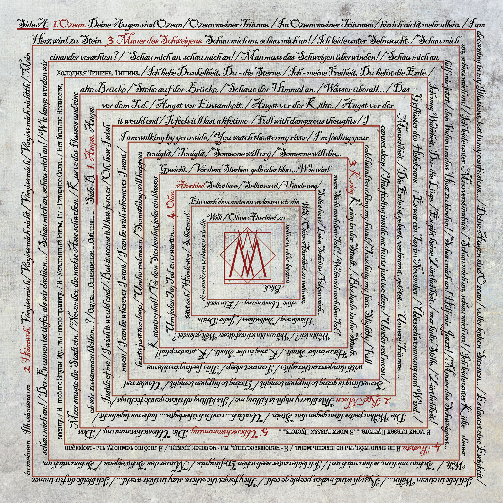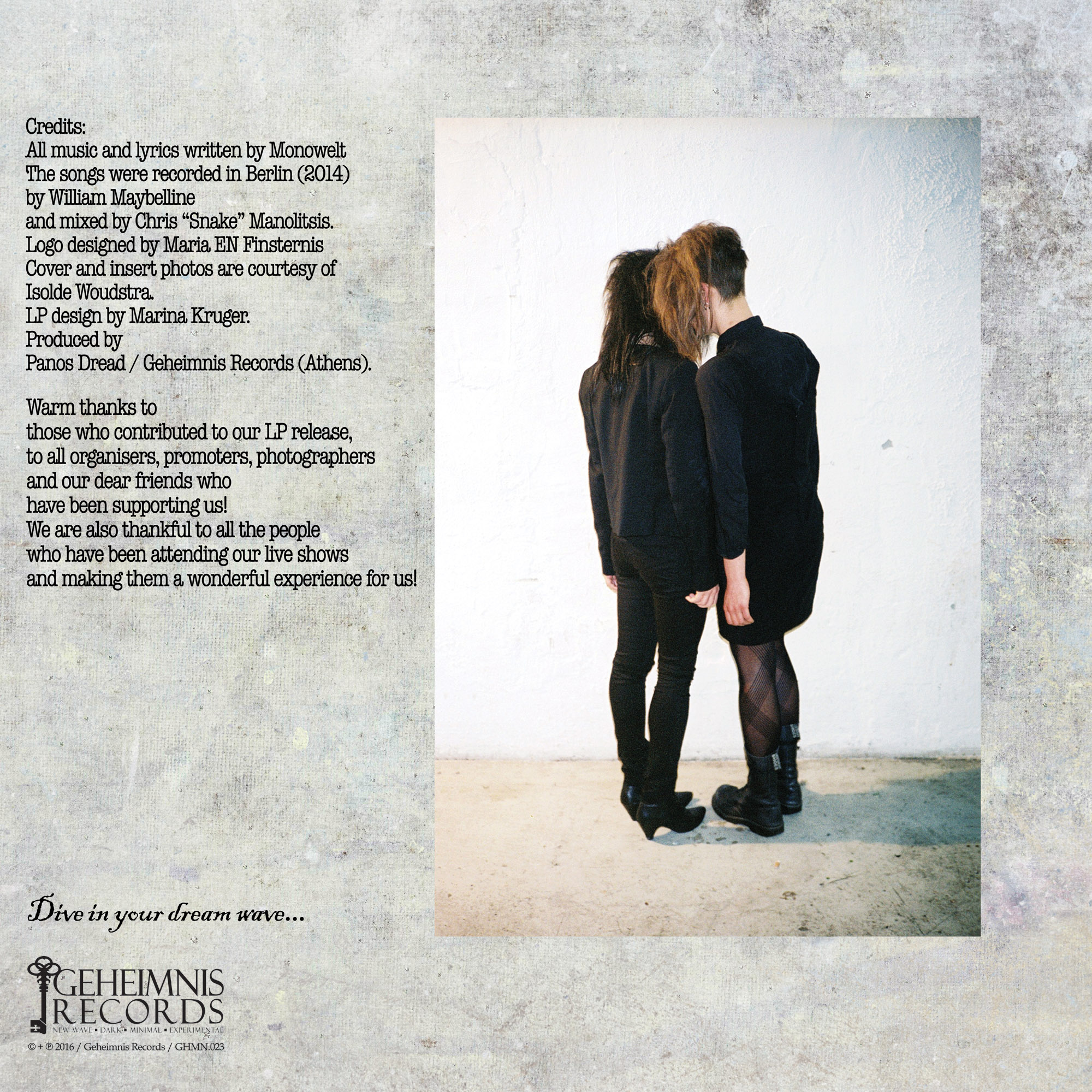 "Monowelt" have started up their trip in 2012. They consist of 2 females, Marta Raya & Daria Leere. Minimalistic dark/synth wave with exceptional melodies and haunting voices. The use of analogue synthesizers, drum machines and atmospheric bass guitar creates an eerie, gloomy environment, claustrophobic and obscure, wet, cold and beautiful. Their first ever appearance with the track "Ozean" was made through our "Synthetic Soundscapes of Modern Urban Morality" compilation and now it's time for their first ever LP on vinyl, in 305 hand-numbered copies, 150 of them on black and 155 on clear transparent vinyl. Includes insert with lyrics and credits and a download code for digital downloading. Special thanks to William Maybelline (Lebanon Hanover) for his helping hand (recordings) and Chris Manolitsis for the final mixes. | ||