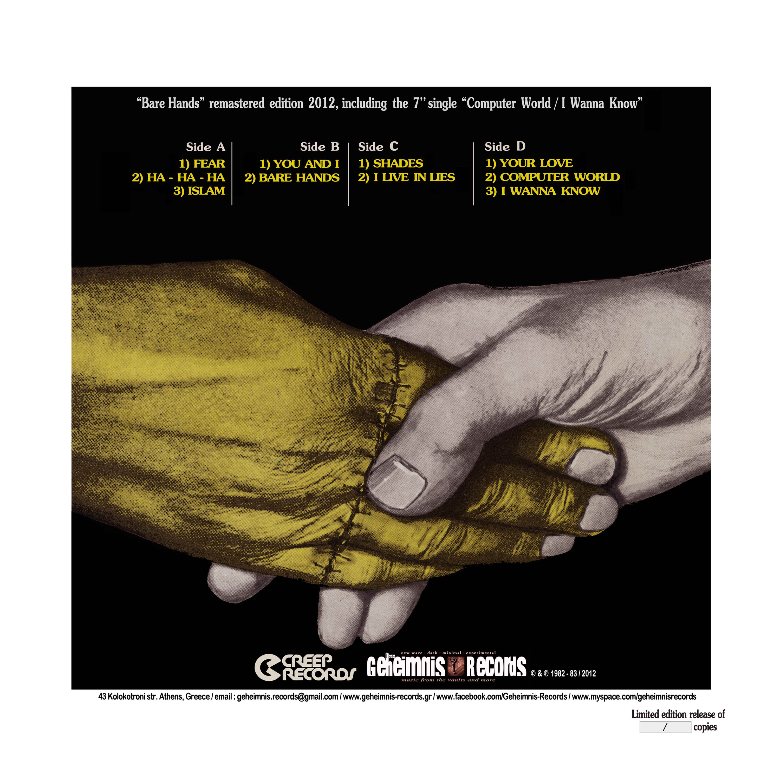 | Geheimnis Records is pleased to announce the reissue of the classic 1983 album “Bare Hands” by The Reporters, including the tracks from the 1982 7” single “Computer World / I Wanna Know”, in a special limited edition release entitled “Bare Hands / 30th anniversary edition”. This reissue is an emotionally charged one , because both the band’s releases are among our all-time favorite releases to have come out from the Greek new wave scene of the ‘80s and, apart from this, the album is the first LP release by the legendary label “Creep Records”. This year, we’re celebrating 30 years, since their first release back in 1982 on Creep Records. The band itself was a collaboration and coexistence of 5 very talented young musicians, that unfortunately split up just a year and a half after its first appearance. Nevertheless, they managed to leave us with 2 records (one 7” single and a full-length LP album) of a very-well-constructed and formed New Wave/Post Rock sound, that was, at once quite contemporary, but at the same time very unconventional and unexpected. All the instruments are in the right place, at the right time, abandoning though traditional tempo/form and refusing to become predictable and finally boring. The bass line of Solon (Akis) Stathopoulos is dominant, the drums of George Roumanis are unmistakable and with depth, the guitar of Paraskevas (Voulis) Karamikes is as sharp as a surgical blade, the synthesizers of Chrisostomos (Makis) Mouratoglou create all the stressed, anguished and sometimes vivid – or someone might say happy – environment and of course, Costas Pothoulakis (Parthenogenesis, Homicide, Villa 21) stays on the edge, adding his characteristic voice to the whole structure. We missed him so much and this reissue is an homage to his sudden loss. The result of their collaboration is a collection of 10 songs of sound-balancing frenzy, that you can’t find easily, especially in groups of that period, all the more remarkable for a band which released only 2 records and then disappeared The reissue will come out on July 2012 (exact date t.b.a.) in 400 hand-numbered, remastered from the original master tapes, highly collectable copies in a double 10”album, including the tracks of both the album and the 7”, with its original insert + some rare photos of the band. Half of the copies will be pressed in original black vinyl and the rest in transparent orange. The transparent orange copies are totally sold out. From now on you can only order the classic black copies. Last 44 copies in stock !! | ||